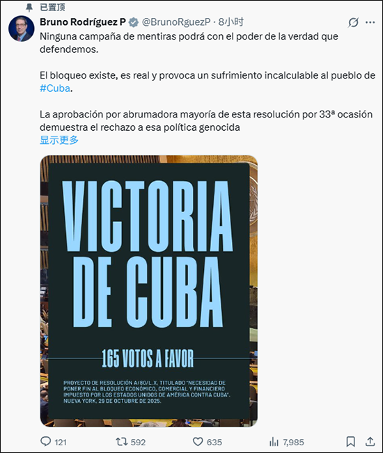 此外,古巴外长罗德里格斯当天也在X平台上表示,"没有任何谎言宣传能够战胜古巴所捍卫真理的力量。虽然封锁确实存在,也给古巴人民带来了无法估量的痛苦,但联大第33次以压倒性多数通过这项决议,再次表明国际社会坚决反对这种'毫无道义依据、带有种族灭绝性质'的政策。"