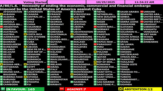 联合国网站消息,当地时间10月29日,第80届联合国大会针对"必须终止美国对古巴的经济、商业和金融封锁"完成一般性辩论后,高票通过A/80/L.6决议草案。这是联大连续第33次通过相关决议,中国投下赞成票。