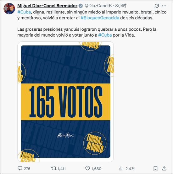 决议通过当天,古巴国家主席迪亚斯・卡内尔在X平台上发文,庆祝联合国大会再次以压倒性多数通过决议。