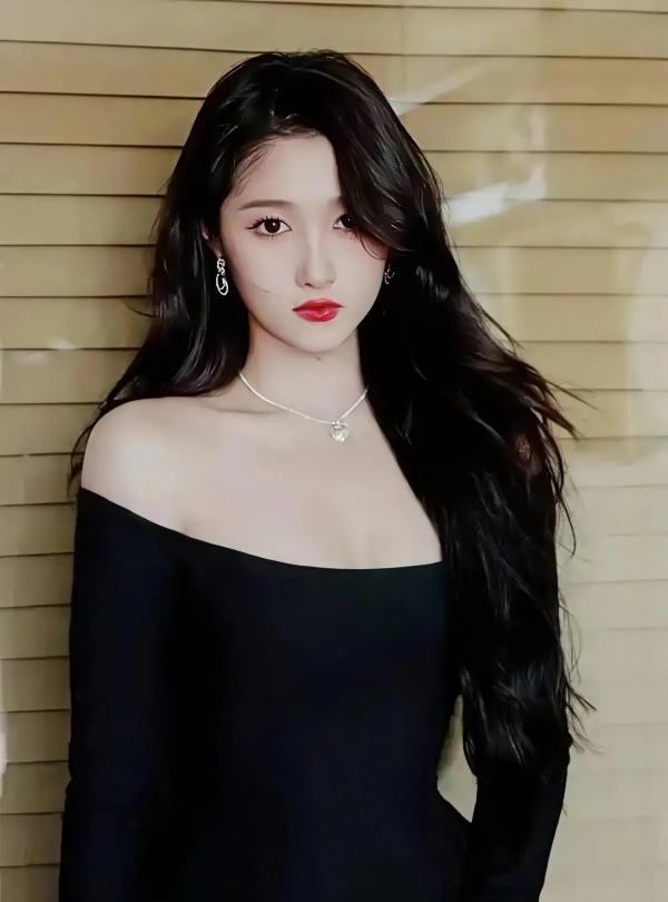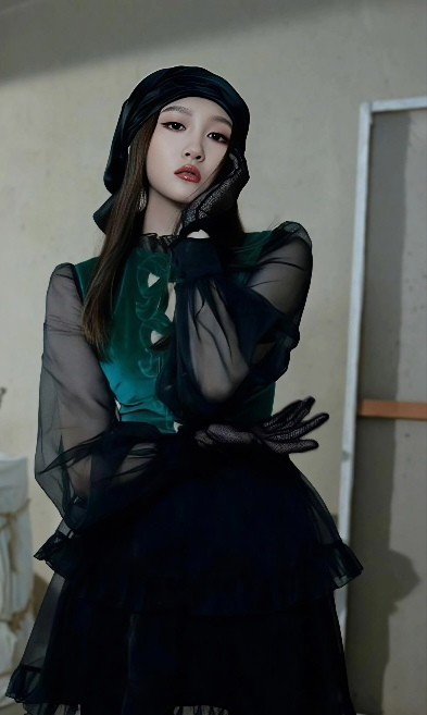 其实这造型要说多复杂也不见得。上衣是重点,黑色蕾丝拼接,领口收得利落,袖型带点复古意味,紧贴手臂线条,偏偏在腰侧和肩头留了小面积的透视,皮肤就这么悄悄露了一线,轻巧得很。不是那种"我特意要你看见"的张扬,倒像是你不经意一瞥,才发现的细节。这种设计最考功力,差一厘米可能就俗了,多一针蕾丝也许就闷了,可它偏偏拿捏住了。底下配了条纯黑色高腰直筒裙,没一丝花纹,也没额外装饰,就这么干净地往下走,把所有注意力都往上引--聪明吧?