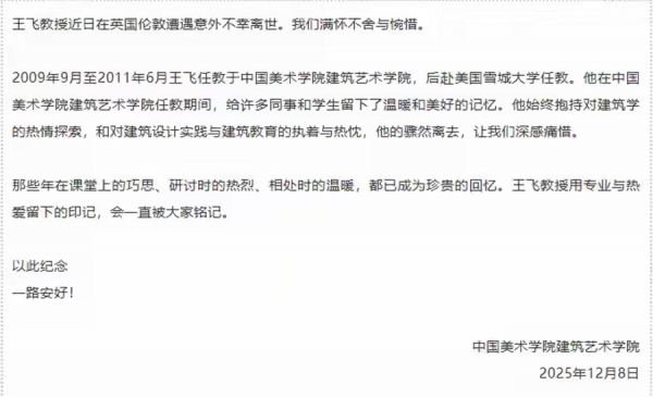 12月8日,一个令人心碎的消息从伦敦传来--著名建筑教育家、美国雪城大学副教授王飞先生因意外不幸离世,年仅45岁。这个消息如晴天霹雳,让整个建筑学界陷入巨大的震惊与悲痛之中。一位正值事业巅峰的学者,就这样突然告别了他热爱的讲台与设计事业。