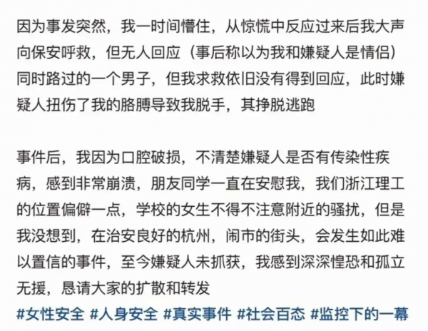 不过呢,咱们的女主角可是个勇敢的姑娘!事后她不仅没有被这事儿击垮,反而勇敢地站了出来,发声揭露了事情的真相,还寻求了媒体的帮助。她说:"好害怕那男子有什么传染病,真的不敢相信闹市街头会发生这种事。" 听听这语气,既无奈又坚强,真是让人既心疼又佩服!