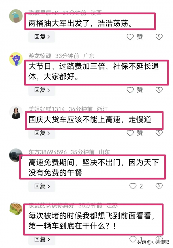 也有网友认为:每年国庆高速免费,堵车都是一道靓丽的风景线。管理部门不会想办法解决,司机们也一如既往地非要上高速蹭热闹。难忘的国庆节。