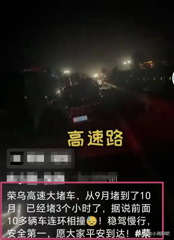 荣乌高速上的车主表示:前方发生了10辆车子的连环相撞,已经是10月1号凌晨了,车子还一动没动。