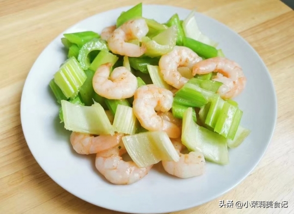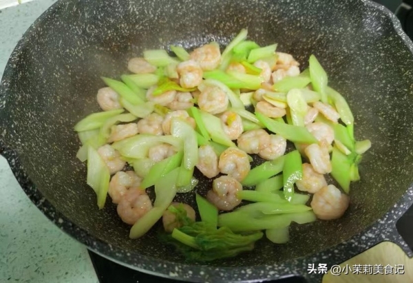 3、锅里放油,先加蒜蓉和姜蓉,虾仁在里边炒炒,变色后把芹菜倒进去,继续炒两分钟左右,彻底熟透,加点生抽和盐,扒拉入味后出锅。
