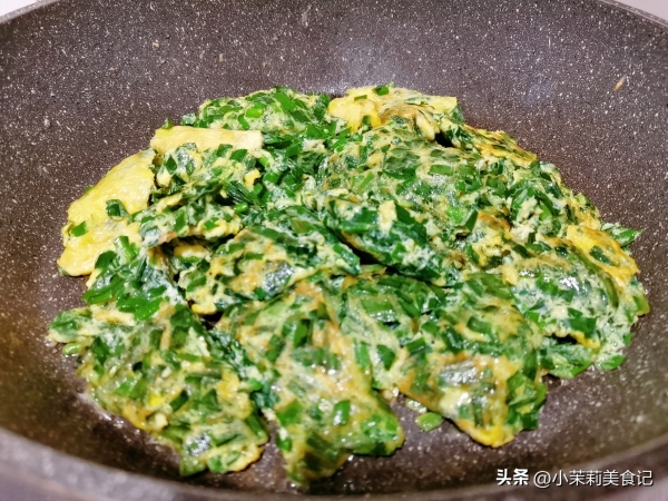 3、起锅放油,将其热透,韭菜和蛋液都倒里边,开始凝固后再翻动,全都炒熟后装盘。