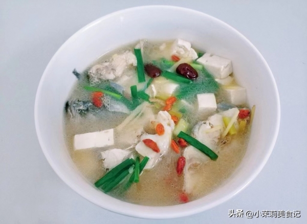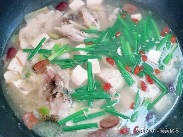 4、这时候把豆腐也倒进去,枣放里边,咕嘟二十分钟,最后加点盐,胡椒,香葱以及枸杞。搅匀后出锅。