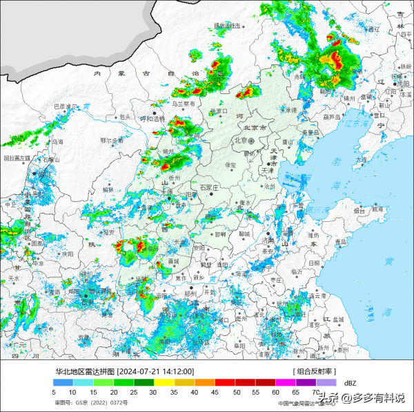 下午14时雷达监测显示,由于降雨回波向东北移动,而北部地区的张家口北部以及承德西南部正在受影响。