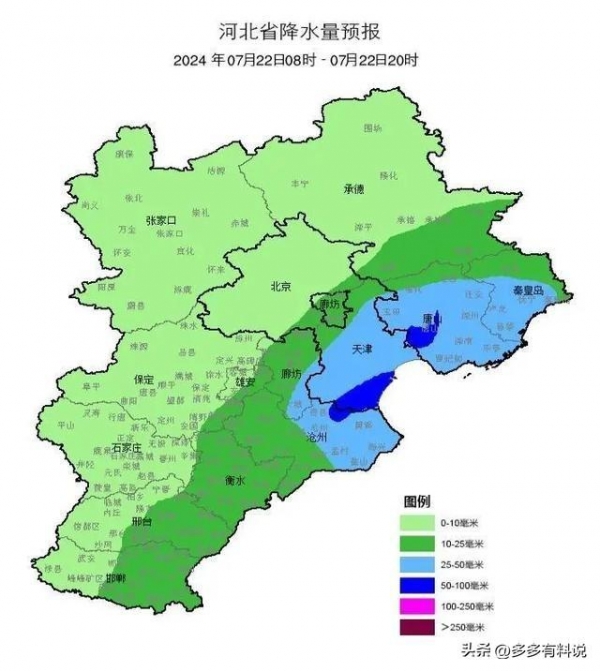 在到大雨主要分布在:承德东部、秦皇岛、唐山、廊坊、沧州、衡水、邢台东部、邯郸东部。局部还会有短暂性的暴雨出现,局部地区还伴有强对流天气。