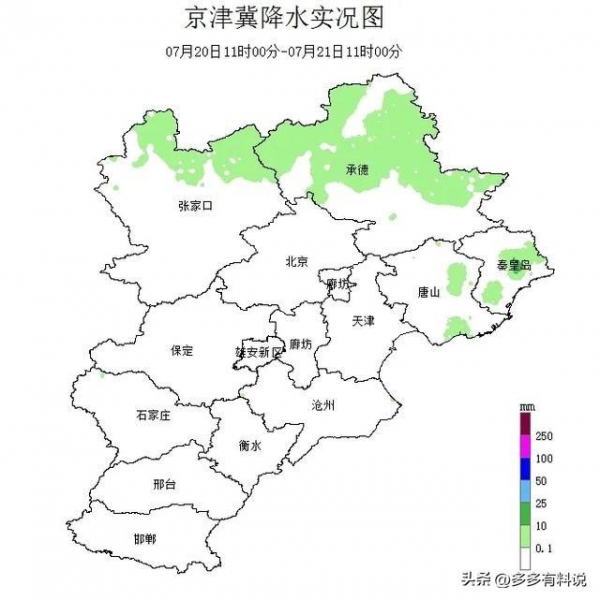 从降水量实况图可直观的看出来,昨天下午~今天(21日)下午14时期间,我省北部的降水量比较明显,在张家口、承德、秦皇岛一带。