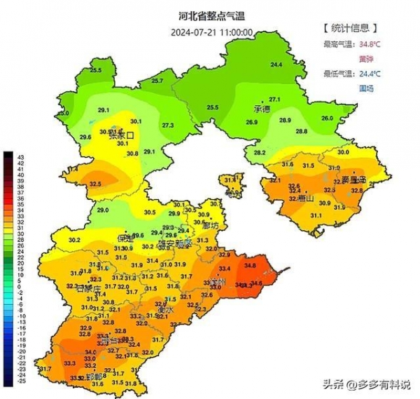 而今天的气温,沧州的颜色最为红,沧州东部的气温也是最高的,在34℃以上,而张家口、承德,保定中部的受降雨影响,气温体感比较舒适,其他大部地区在30℃左右,总体来说,哪有降雨,哪儿的气温就会稍微凉快一点儿。