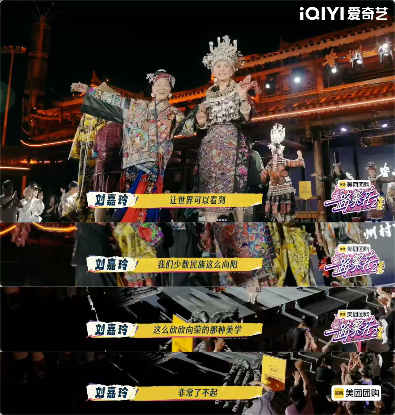 而本期最大看点,莫过于繁花团在贵州村T的惊艳亮相。姐弟们亲自参与服饰挑选、妆发、走秀全流程,近距离触摸民族传统服饰上的纹样与刺绣工艺。据悉,贵州村T是以村民为主体,将苗绣、银饰、芦笙舞等非遗元素搬上T台的公益性文化展演活动,台上的村民模特虽不专业,但当银饰叮当作响、刺绣流光溢彩,非遗技艺也在行走间焕发出当代生命力,文化自信则以最真实、最朴素的方式被看见。刘嘉玲在参与走秀后动情表示:"能让世界看到我们少数民族这么欣欣向荣的美学,是非常了不起的。"节目以综艺为桥梁,联动当地文旅打通非遗传播的新路径,真正实现了让民族美学"活"起来。