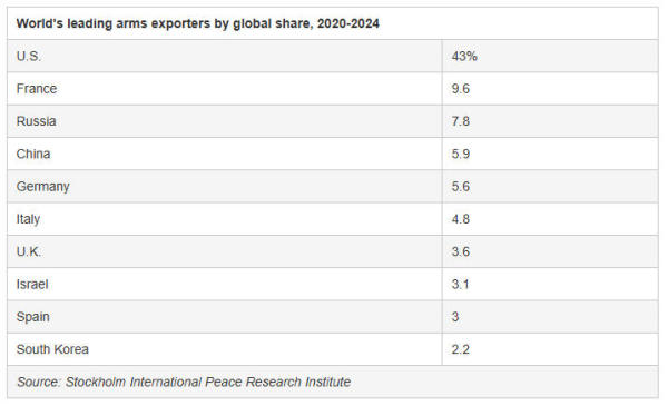 根据斯德哥尔摩国际和平研究所的数据,韩国在2020至2024年期间的国防出口排名第10。政府目标是发展其国防工业,使之接近美国、俄罗斯和中国的水平。