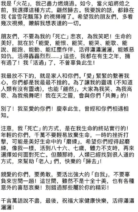 今天在看到这封"遗书"的内容时,我们真的很替她高兴,无论最后是什么原因让她选择结束生命,在最后时刻,回顾起这一生,她仍给出了正向的评价。对于她自己,她是满意的。