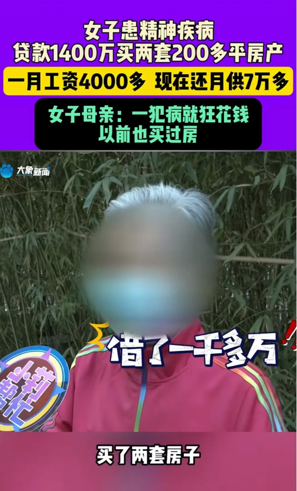 河南郑州,女子患精神疾病,却贷款1400 万买两套房产!更离谱的是女子月工资只有 4000 多,现在月供 7万多根本还不上!女子母亲质问:"贷款是怎么通过的?"网友:我一直以为我没买房是因为没钱,现在晓得了,是因为没精神病!