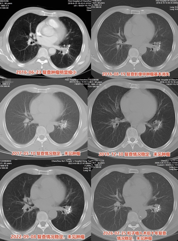 那些比芝麻还小的放射性粒子,在李伯伯体内安静工作了数月后静悄悄退休,而十年后复查影像中那些残留的金属空壳,换来的则是李伯伯的生命奇迹,他可以继续抽着戒不掉的烟(但是对于任何肺部疾病患者,我们都仍然强烈建议立即戒烟喔)、看着小孙子出生长大、健步如飞干着自己熟悉的农活。