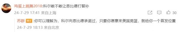 有球迷向著名篮球解说员苏群发表了提问,内容是科尔敢不敢让恩比德打替补,苏群老师是这么回复的:"你可以理解为,科尔向恩比德承诺过,只要你愿意来美国男篮,就给你一个首发位置。"这番话很好理解,恩比德拥有喀麦隆、法国和美国三重国籍,但大帝之前曾表示会为法国男篮打球,结果后面叛逃到美国男篮去了,因为科尔给了他承诺,你来美国男篮,我就给你一个首发位置,既然科尔话都说出去了,那么他现在当然不能反悔。