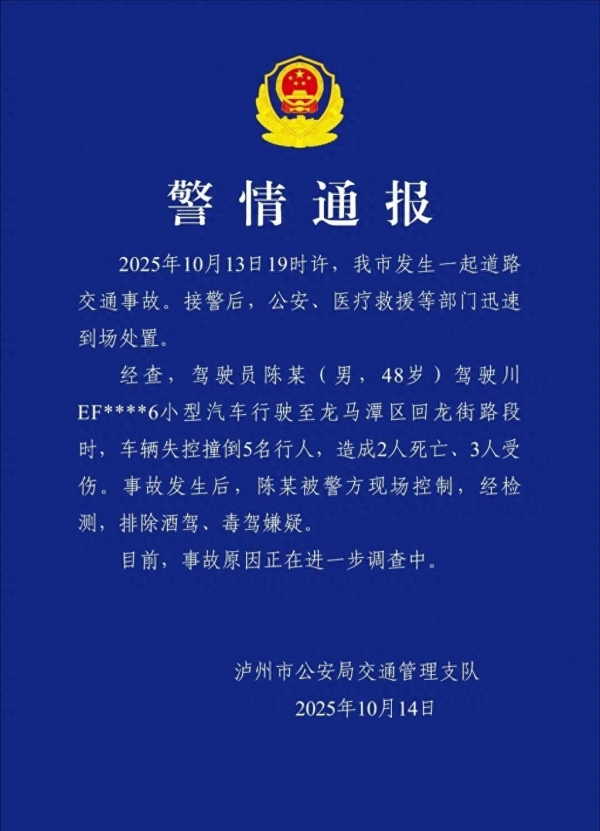 经查,驾驶员陈某(男,48岁)驾驶川EF****6小型汽车行驶至龙马潭区回龙街路段时,车辆失控撞倒5名行人,造成2人死亡、3人受伤。事故发生后,陈某被警方现场控制,经检测,排除酒驾、毒驾嫌疑。