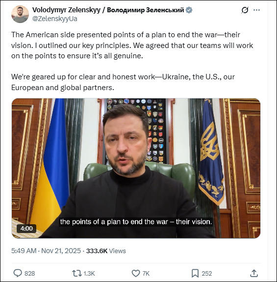 泽连斯基10月23日曾表示,与俄罗斯进行任何形式领土交换都"不可接受"。但他21日在X平台上发布视频声明,并写道:"美方提交了结束战争的计划要点--这是他们的愿景。我阐述了我们的核心原则。双方一致同意,两国团队将围绕这些要点开展工作,确保所有内容都切实可行。"