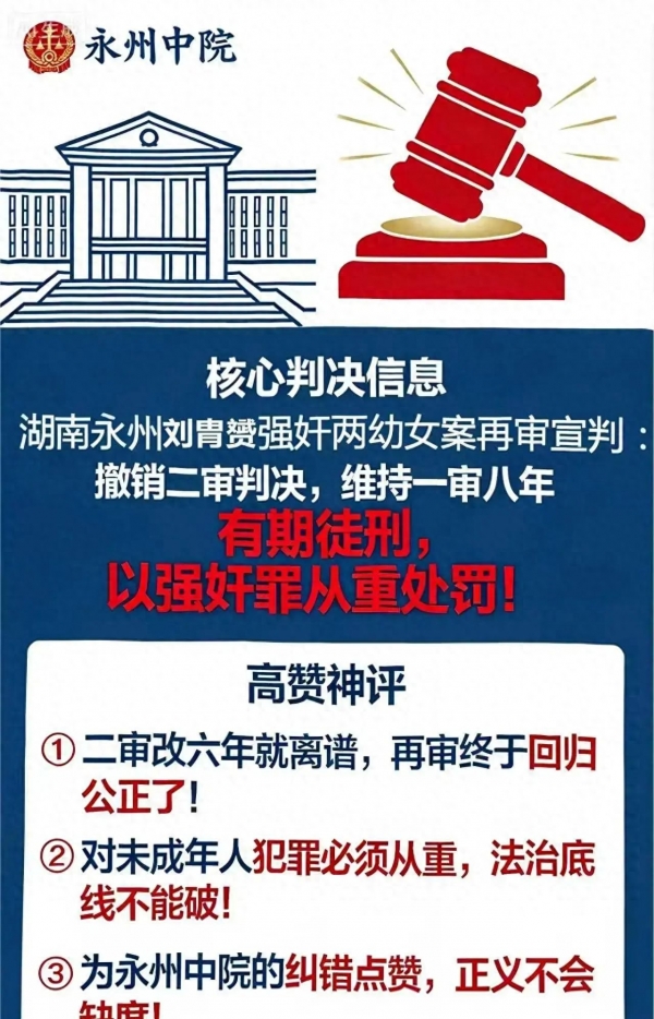 湖南永州的案子又有了变数,这次刑期又回去了。1月14日,永州中院直接把刘胄赟的量刑从六年拉回到八年。这是一次反转,很多人看到这判决都愣了一下。案子的核心原因说到底,牵扯到两个还没满13岁的女童,而其中一个还是三次。这种情况,法律上说得很明白,不在乎有没有暴力,未成年受害人根本没办法同意,这种事就不能轻轻带过。