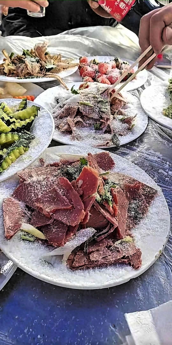 当天中午,宋屯村院里支起白帐篷,二十多桌流水席摆满了雪地,王先生指着视频说,黄瓜条、凉拌鸡丝这八道凉菜码得齐整,牛肉片上正好落着没化的雪,原本就挺热闹,雪一飘反倒更显眼了,每桌还配了四道热汤,可不少菜盘边儿都结了霜。