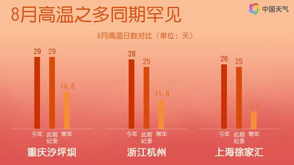 不仅高温强度强,持续时间也长。多地高温日数都超过了20天,尤其南方高温日数大幅偏多10天以上。像重庆沙坪坝和新疆吐鲁番,8月高温日数高达29天,几乎"全勤";浙江杭州8月高温多达28天,为高温最多的8月;上海徐家汇26天,为当地观测史里高温最多的一个月。