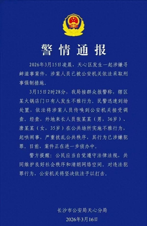 3月16日,当地警方发布了通报,对涉事两人的身份,行为性质进行了公布。