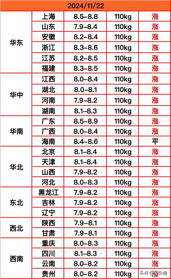 其中华东、华中、华南地区全面涨价,华北和东北地区也全面涨价,西北和西南地区也全面涨价。