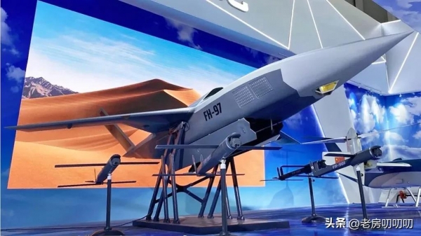再看包成粽子的无人机轮廓,外形酷似珠海航展上展出过的飞鸿FH-97模型,机头下方的凸起可不得了,很可能集成了低可探测性光电瞄准系统(EOTS),从构型上看它应该是一款无人忠诚僚机。