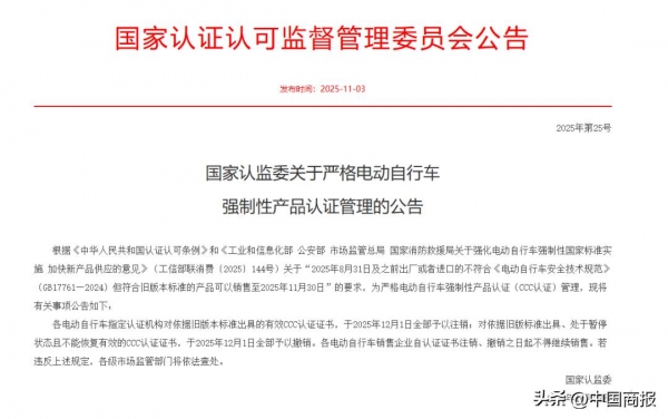 今年10月,国家认监委发布《关于严格电动自行车强制性产品认证管理的公告》(2025年第25号),对电动自行车生产、销售作出明确规定。
