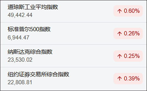 当地时间1月15日,美股三大指数全线收涨。截至收盘,道琼斯工业平均指数表现领跑,上涨0.60%,报收于49442.44点;标准普尔500指数录得0.26%的涨幅,报6944.47点;纳斯达克综合指数紧随其后,微涨0.25%,报23530.02点。此外,纽约证券交易所综合指数也表现不俗,全天上涨0.39%,报收22808.81点。