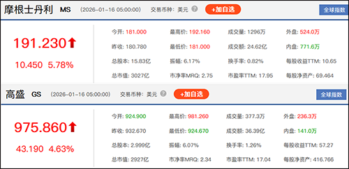 另一方面,15日美股盘前,摩根士丹利公布的2025年第四季度业绩报告显示,去年第四季度,营收录得178.9亿美元,同比上升10.3%,高于市场预期的177.7亿美元;每股收益2.68美元,亦强于预期的2.44美元。其中,备受关注的"财富管理"部门净新增资产达到1223亿美元,大幅超出市场预期。
