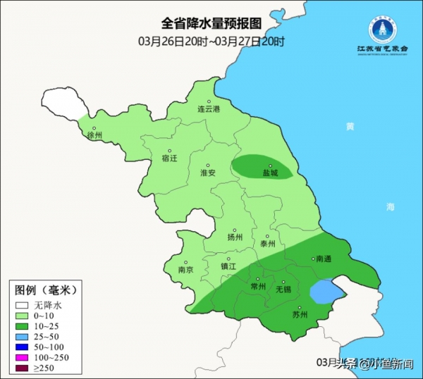 江苏省气象台2025年03月26日09时00分发布寒潮蓝色预警:受强冷空气影响,预计26日夜里到29日,徐州、宿迁、连云港及淮安和盐城的部分地区48小时最低气温将下降8~10℃,并伴有陆上5-7级,江河湖库及近海海面7-9级的偏北大风。省应急厅(省防减救灾办)、省气象局提醒注意防范。