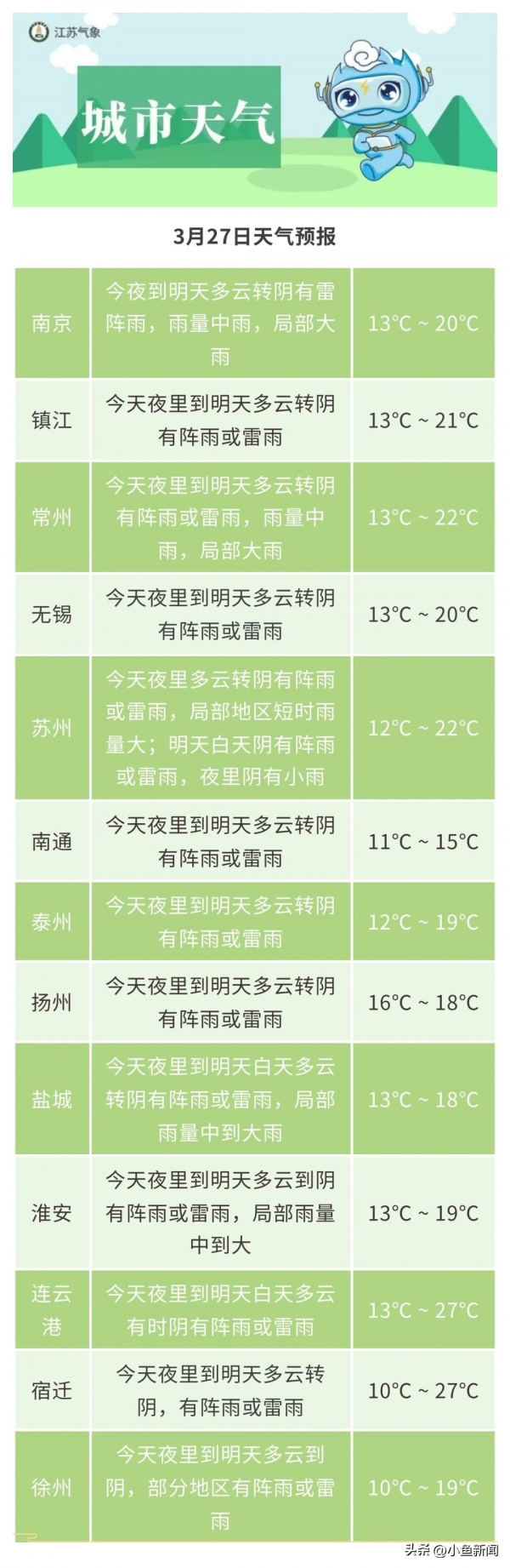 淮河以南地区阴有阵雨,其他地区阴转多云。最高温度:本省西北部地区13~14℃,本省东南部地区12℃左右,其他地区16℃左右;最低温度:苏南南部地区8~9℃,其他地区6~7℃。全省偏北风5级阵风6-7级。