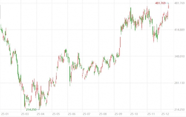 周一特斯拉延续其上周五涨势,最终收涨3.56%,创年内新高。盘中股价曾涨4.9%、最高触及481.77美元,一度突破2024年12月17日的收盘纪录479.86美元。