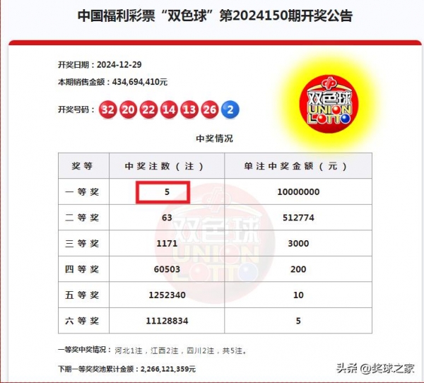 双色球24150期中奖情况:本期一等奖开出5注,每注奖金1000万元。一等奖花落三省:江西2注,四川2注,河北1注,共5注。
