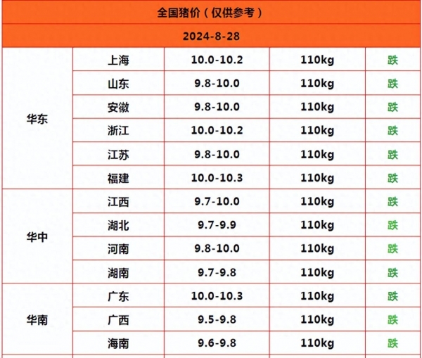 华中地区:河南下跌0.1元/斤,标猪出栏参考价9.8~10.0元/斤。