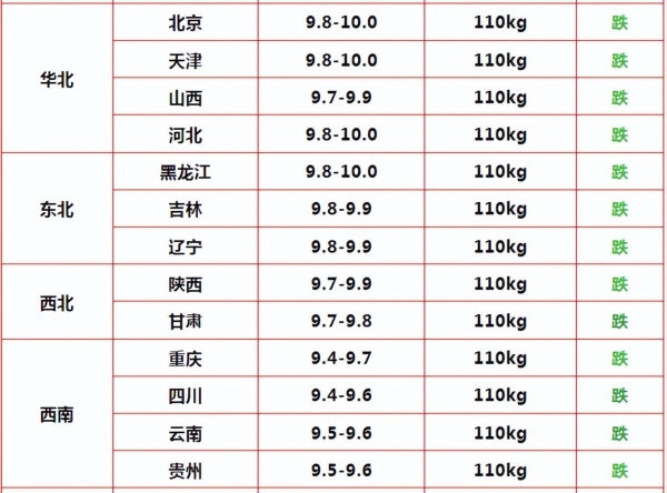 华北地区:河北下跌0.2元/斤,标猪出栏参考价9.8~10.0元/斤。