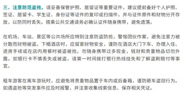 请妥善保管护照、居留证等重要证件,建议提前备好个人护照、签证、居留卡、学生证、身份证等证件的复印或扫描件,并与证件原件和财物分开存放,以防同时丢失。搭乘公共交通请务必确认证件随身携带,避免遗落。