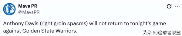 北京时间12月26日,NBA年终大战独行侠客场大战勇士,独行侠球星安东尼-戴维斯又伤了,腹股沟痉挛提前退出比赛。
