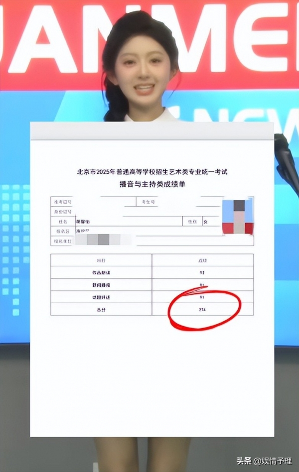 每一门的成绩都是90分以上,总分高达274,胡馨怡成了北京播音统考的第一名。