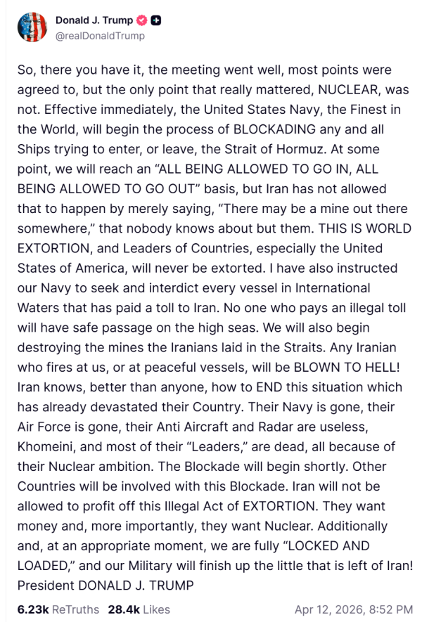 特朗普称,他已指示美国海军,在国际水域中搜寻并拦截每一艘向伊朗缴纳过通行费的船只。任何支付"非法通行费"的人,都不会在公海上获得安全通行。"我们还将开始清除伊朗在海峡中布设的水雷。任何向我们或向和平船只开火的伊朗人,都将被彻底摧毁!"