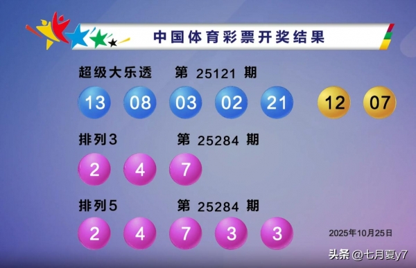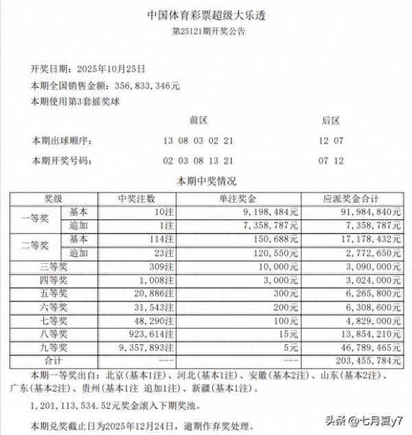 2025年10月25日,大乐透第25121期开奖号码为:前区02、03、08、13、21,后区07、12。本期全国销售额达3.57亿元,开奖后奖池金额滚动至12.01亿元。