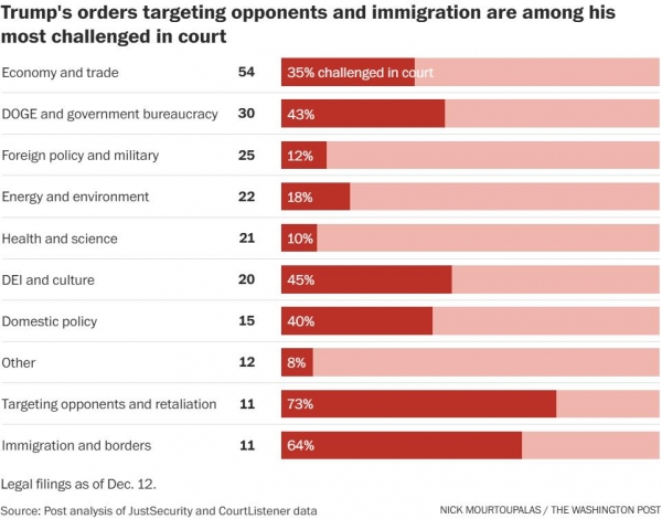 在11道旨在惩罚其政敌的行政令中,近四分之三都已被提起诉讼。