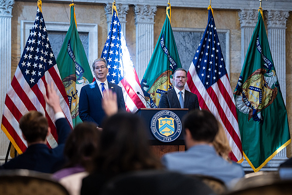 当地时间2025年10月15日,美国华盛顿,美国财政部长斯科特·贝森特和美国贸易代表杰米森·格里尔在财政部总部举行记者会。