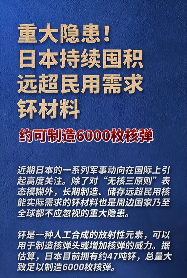 日本目前所囤积的钚已经达到了惊人的47吨,这些材料能够制造出将近6000枚核弹头,远远超过了民用材料的范畴,对此,中美俄韩难得齐心协力,对日本亮出了红牌。