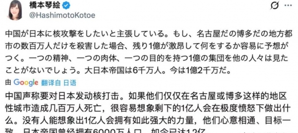 日前,日本右翼核心人物桥本琴绘疯狂挑衅,鼓吹日本可不怕遭到中国核打击,即便被中国投下了一枚核弹,最多也就是死几百万人,而剩下的1亿日本人将会全部与中国玉碎战死。