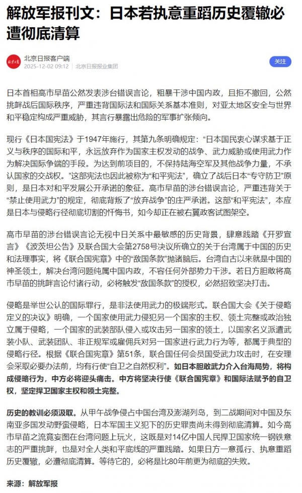 日前《解放军报》就给日本敲响警钟,首先批评日本政府早已偏离和违反了"和平宪法",彻底背叛了"放弃战争"的承诺;其次忠告高市早苗,胆敢将其挑衅言论付诸行动,中方必将援引"敌国条款"坚决打击;最后提醒日本政府好自为之,挑战14亿中国人民,只会遭到比80年前更彻底的失败。