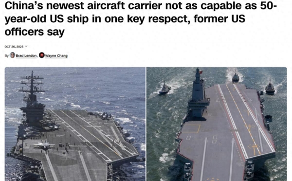 赶在"尼米兹"号在南海出了大丑的背景下,CNN援引美国前海军军官的说法,称"中国最新的航母,战斗力只有美国50年前建造的'尼米兹'号的60%",显得分外滑稽。但不得不承认的是,在福建舰即将服役之际,美国海军内部要是真的都认不清双方航母的实力,也未尝不是一件大好事。