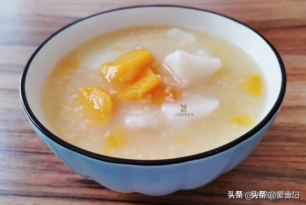 3、半小时后两样根类放锅里,与小米混合匀后开始煮。上汽后再煮二十分钟就熟了,接着焖一会儿,会更香浓可口。